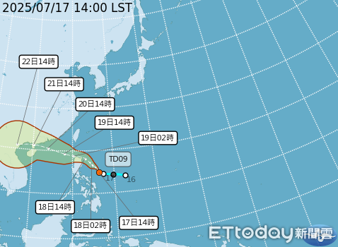 ▲熱帶性低氣壓TD09預計今晚形成薇帕颱風。(圖/氣象署)