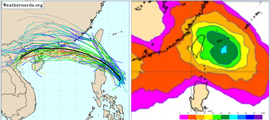 此外,下週一至週四(21至24日)各國模式顯示,「季風低壓」內還有另一「熱帶系統」發展,其中不乏「來者不善」、且具「嚴重威脅」的模擬路徑;歐洲系集模式50次的模擬亦顯示,北台灣被侵襲機率,最高達50%(右圖)。各國模式皆持續調整中,應密切觀察。