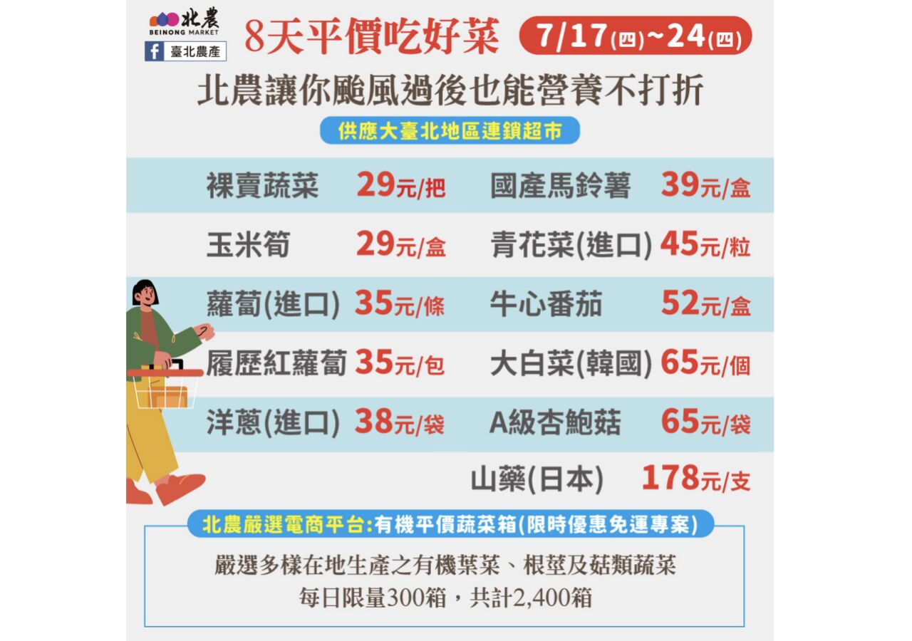 自即日起到7/24,北農於大臺北地區連鎖超市通路提供11項平價蔬菜,包括裸賣蔬菜29元/把、牛心番茄52元/盒、日本山藥178元/支、國產馬鈴薯39元/盒、進口洋蔥38元/袋、玉米筍29元/盒、進口蘿蔔35元/條、履歷紅蘿蔔35元/包、韓國大白菜65元/個、進口青花菜45元/粒、A級杏鮑菇65元/袋,預估供應量可達50公噸。同時在北農嚴選電商平台,推出限時優惠「有機-平價蔬菜箱-免運專案」,禮箱內容嚴選多樣在地生產之有機葉菜、根莖及菇類蔬菜,每日限量300箱,共計2,400箱,選購網址https://tapmc.pse.is/tezvb,售完為止,提供民眾更多選擇。