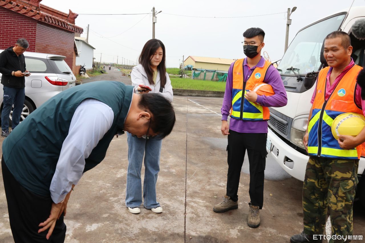▲台南市長黃偉哲赴後壁災區視察災後清運作業,向清潔隊鞠躬感謝投入災後復原的清潔工作。(記者林東良翻攝,下同)