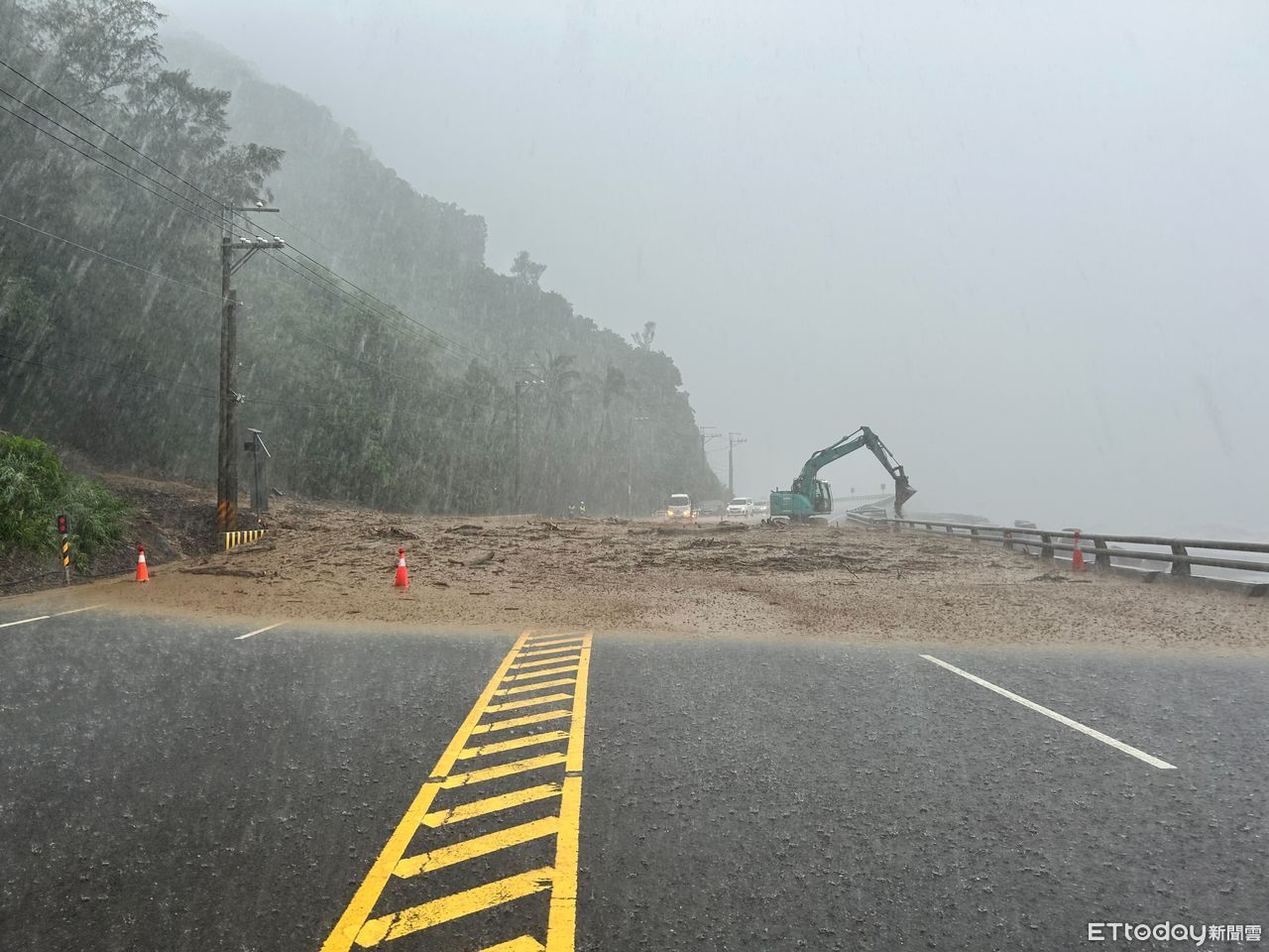 輕颱薇帕暴風圈正逐漸通過台灣南方近海,豪雨導致台9線405公里大溪路段土石流爆發,雙向交通中斷。現場已有一部挖土機搶修清理,廠商也緊急調派其他機具趕往支援。