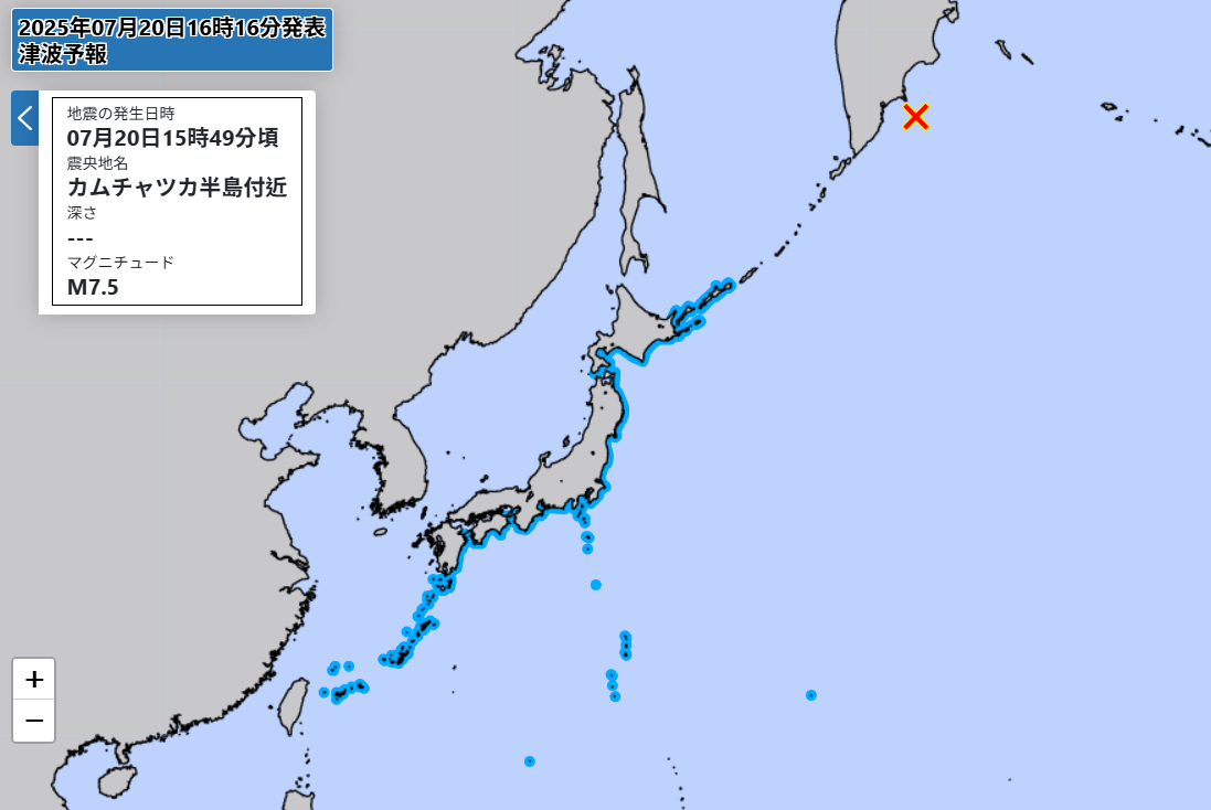 俄羅斯堪察加半島外海20日下午接連發生多起地震,其中最強的一次地震規模達7.4(原為7.5,後下修)。對此,日本氣象廳也緊急針對北海道至沖繩的太平洋沿岸地區發布海嘯預報,提醒民眾注意部分海面波動,不過暫時不須擔心造成危害。