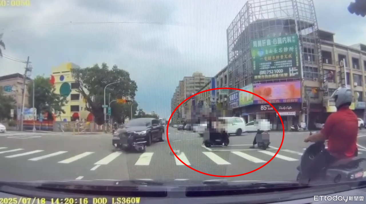 行車紀錄器畫面中可以看見,轎車在路口剛起步左轉,對向機車卻高速衝來,騎士當場大字型噴飛,更接連撞倒停在待轉區的2輛機車,2騎士、1乘客就這樣無辜被擊落重摔在地,過程相當驚悚。
