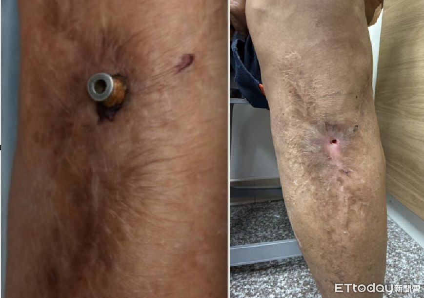 ▲莊老先生左小腿有螺絲外露,經手術順利取出。(記者林東良翻攝,下同)