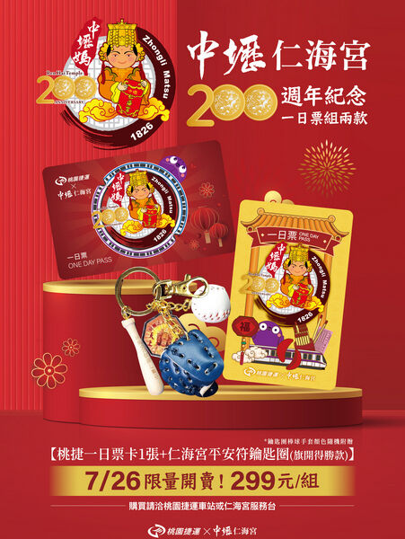 為慶祝仁海宮建廟200週年,桃捷公司同步推出限量紀念聯名套票,自7月26日起於機場捷運全線車站(A20除外)限量販售,每套售價299元,售完為止!