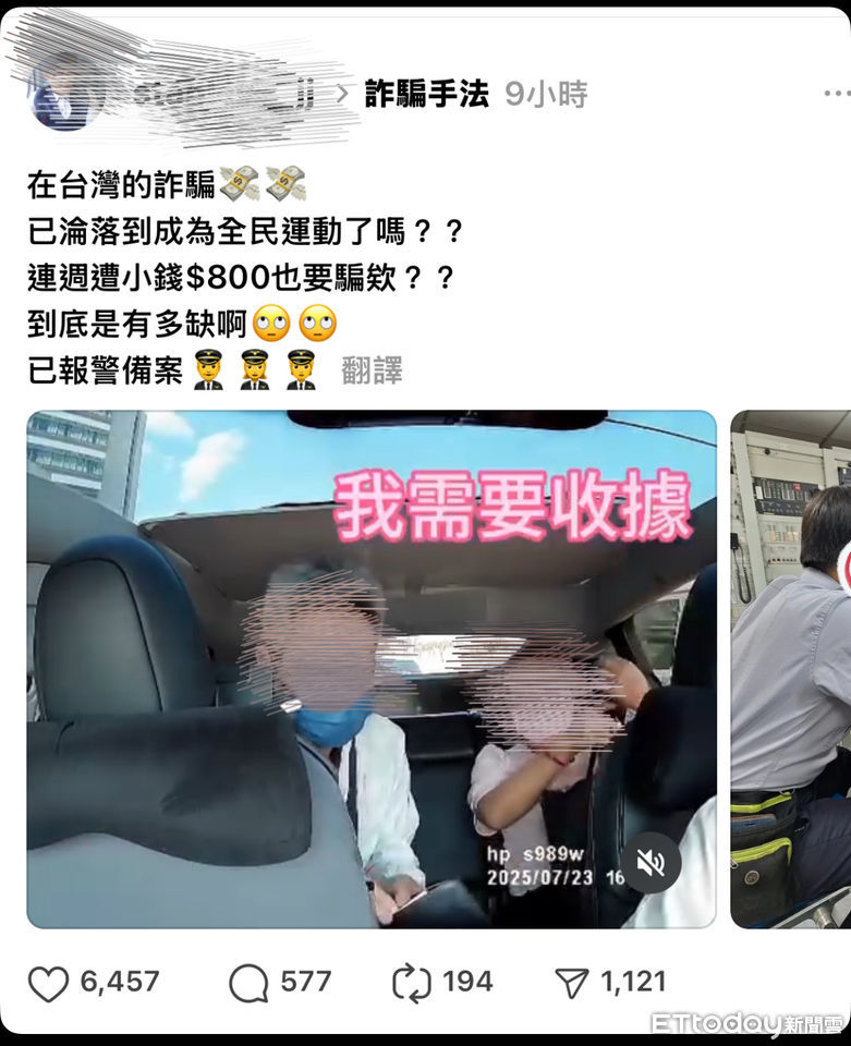 劉姓運將在脆上發文,「在台灣的詐騙,已淪落到成為全民運動了嗎??連週遭小錢$800也要騙欸??到底是有多缺啊!已報警備案,並將雙方在車上付款找錢的畫面放上網請網友協尋,並表示自己已經報警但是就怕找不到人。」