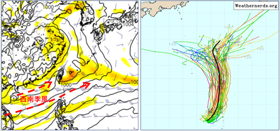 下週二至週五(29至1日)季風環流的西南季風進入台灣附近,大氣不穩定,為中南部多雨型態,有局部陣雨或雷雨,午後影響範圍擴大,其中並有小範圍「劇烈天氣」(雷擊、強風、瞬間強降雨)發生的機率,易致災、應注意;背風面東半部影響較小,偶有局部短暫降雨,未降雨時、天氣悶熱。