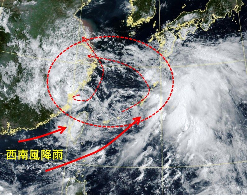 吳聖宇說明,由於低氣壓的位置就在台灣北方,因此將為台灣帶來較強的西南風,並且夾帶水氣北上,中南部地區容易降雨,也會有較大雨勢出現的機會,北部、東半部地區有局部短暫陣雨或雷雨,要注意午後熱對流發展降雨的情況。