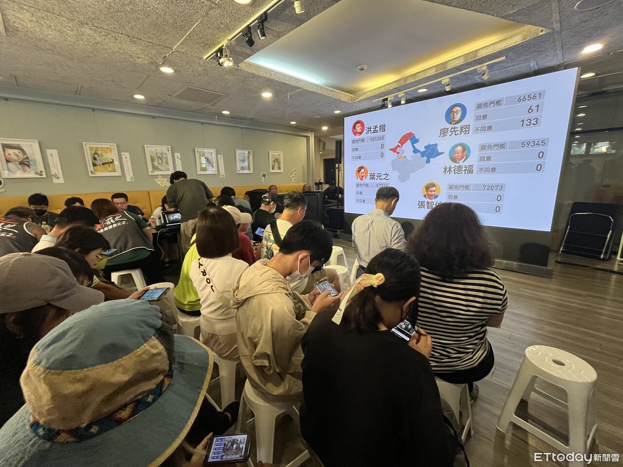 首波大罷免在今天下午四點結束投票,這次新北市共有洪孟楷、葉元之、張智倫、林德福、廖先翔等5案。新北市罷團今天在新北板橋典藏咖啡舉辦「護國保台、新北公民開票之夜」,包括罷團領銜人史書華到場,不少熱情民眾擠入觀看票數統計,加上咖啡廳空間不大,使得現場幾乎擠滿,總數約近百人。