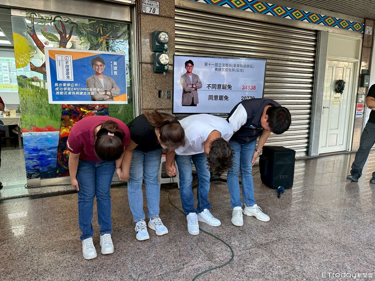 黃建賓下午五點半也帶著家人鞠躬向選民致謝,守住台東藍營立委席次:「雖然我們比較年輕沒有資源,但我只知道,拚就對了,這次台東罷免有兩個指標,這次的台東罷免結果有兩個指標:第一個,同意票門檻沒有過;第二個,不同意票大幅領先同意票。這代表台東的鄉親非常非常地有智慧,我們不會被仇恨的政治鬥爭給欺騙,台東人的意志絕對不會被特定的政黨給操作。所以,我想再次告訴大家,台東只有四種人:家人、朋友、朋友的家人,跟家人的朋友。我們台東的顏色非常多元,有藍天、有白雲,還有翠綠的山林。不論這一次你的選擇是什麼,有一件事情我們都是一樣的:我們都是台東這片土地的孩子,共同守護台東美麗的海岸線,維持和諧的家園,為了爭取台東的公平正義,我們都是同一陣線的人。未來我們一起努力,要為台東做的事情還有很多,明天我們繼續上工。」