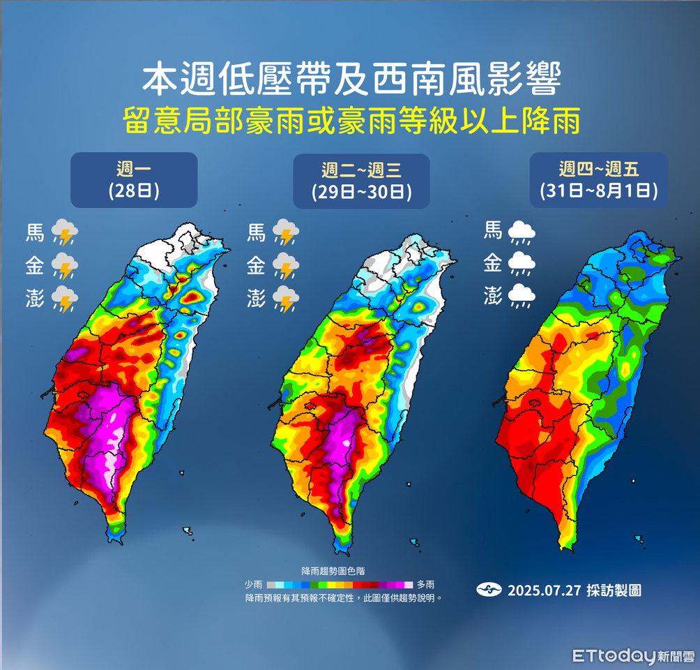 劉沛滕指出,未來一周都是低壓帶加上西南風影響,有局部豪雨機率。今晚到周一中南部雨勢明顯,其他地區雲量增多也有降雨機率。周二至周三中南部山區累積雨量相當多,要留意坍方落石及溪水暴漲,南投及嘉義以南山區有豪雨等級以上,中南部平地也有大雨或豪雨。周四至周六中南部持續有局部豪雨,預計要到周六至下周日才會趨緩。