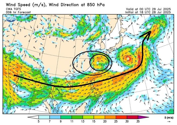 對此,有網友留言,「如果要講的更『專業』一點,就是西南氣流強風軸(局長畫的粗黑線),沒有對準台灣,只是『擦過』台灣。」