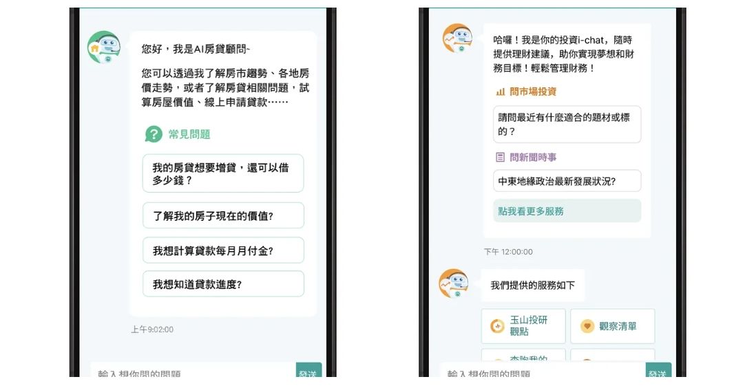 針對房貸服務,玉山銀行導入的「AI房貸顧問」可支援客戶24小時線上即時提問,涵蓋申貸前諮詢、條件試算、貸後管理等流程。客戶可獲得即時市場趨勢資訊與貸款條件說明,亦可快速啟動線上申請流程。針對玉山既有客戶,更僅需確認三項資訊,即可一鍵送出申請,相較傳統流程,大幅減少近90%必填欄位。