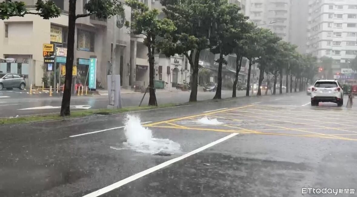 根據統計,左營區自今日凌晨至中午的累積雨量已達50毫米,午後一度有一波強降雨,更讓排水系統面臨嚴峻考驗。在新榮街一帶,疑似因排水溝水位較滿,導致水流從人孔蓋下方不斷湧出,形成一處又一處的小噴泉,宛如水舞秀,景象特殊。