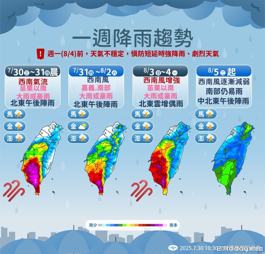 她指出,今天到明天清晨苗栗以南有大雨或豪雨,甚至有豪雨等級以上機率。周四到周六西南風減緩,嘉義以南仍有顯著雨勢。下周日至周一有下一波西南風增強,苗栗以南留意大雨或豪雨。