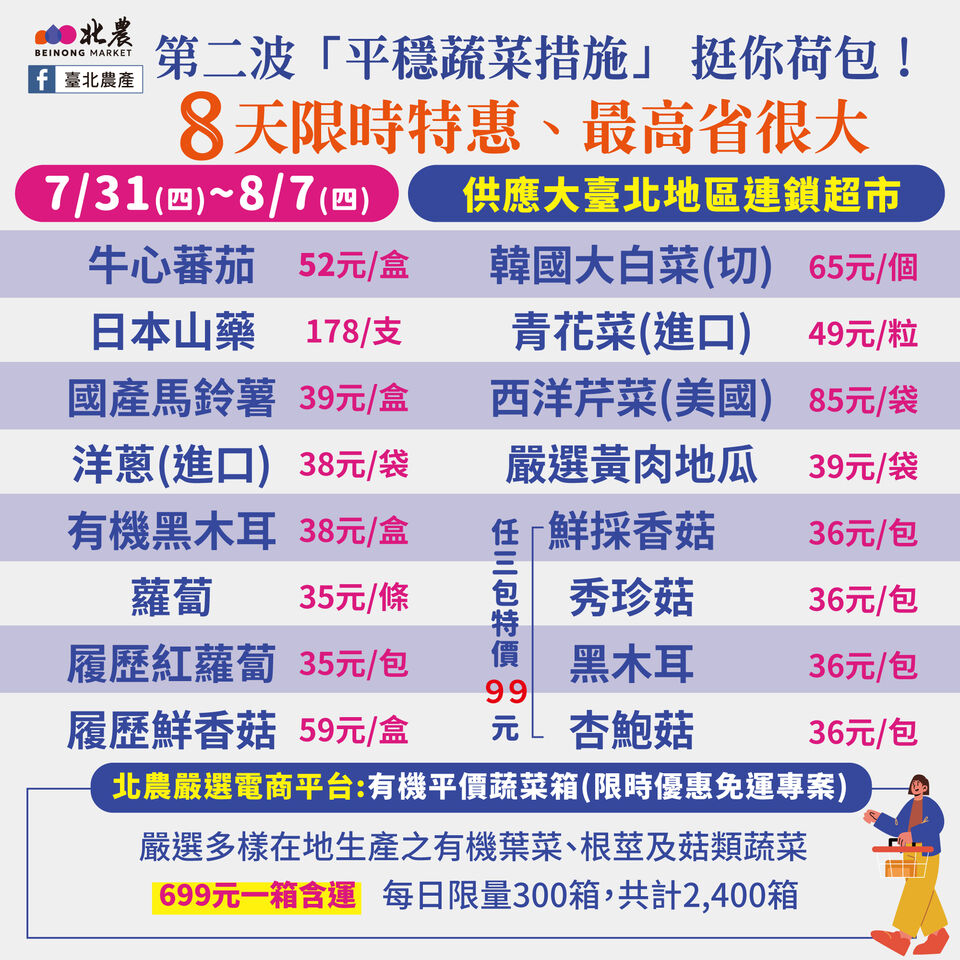 本次共計16樣品項,包括牛心番茄52元/盒、日本山藥178元/支、國產馬鈴薯39元/盒、進口洋蔥38元/袋、有機黑木耳38元/盒、蘿蔔35元/條、履歷紅蘿蔔35元/包、履歷鮮香菇59元/盒、韓國大白菜65元/個、進口青花菜49元/粒、美國西洋芹菜85元/袋、嚴選黃肉地瓜39元/袋,另有鮮採香菇、秀珍菇、黑木耳、杏鮑菇單包特價36元,任三包特價99元,平均一包33元,以上商品均於雙北地區連鎖超市通路,預估供應量可達70公噸,確保民眾以實惠價格購得新鮮蔬菜。