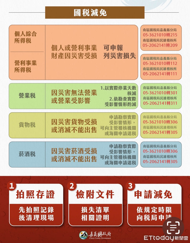 此外,有關所得稅、營業稅、貨物稅及菸酒稅係屬國稅,請先拍照記錄,並於災害發生後30日內,檢具損失清單及證明文件報請國稅局派員勘查。如有疑義,請向財政部南區國稅局嘉義縣分局(電話:05-3621010)或民雄稽徵所(電話:05-2062141)洽詢。