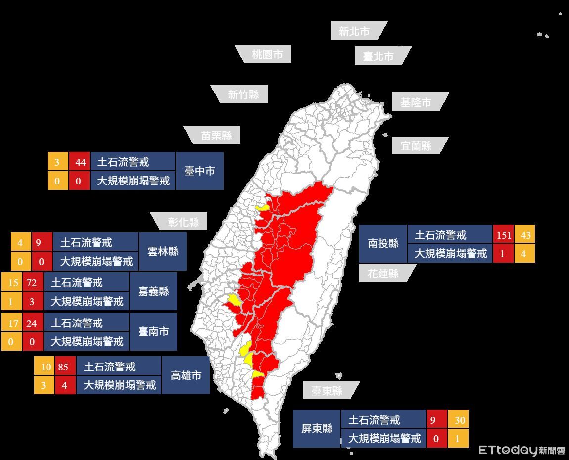 此外,大規模崩塌黃色警戒9處,分布南投縣、嘉義縣、高雄市、屏東縣等4縣、5鄉、6村,其中南投縣4處最多。分布於屏東縣來義鄉來義村,高雄市桃源區寶山里,南投縣鹿谷鄉和雅村,高雄市甲仙區和安里、大田里,嘉義縣竹崎鄉白杞村等。