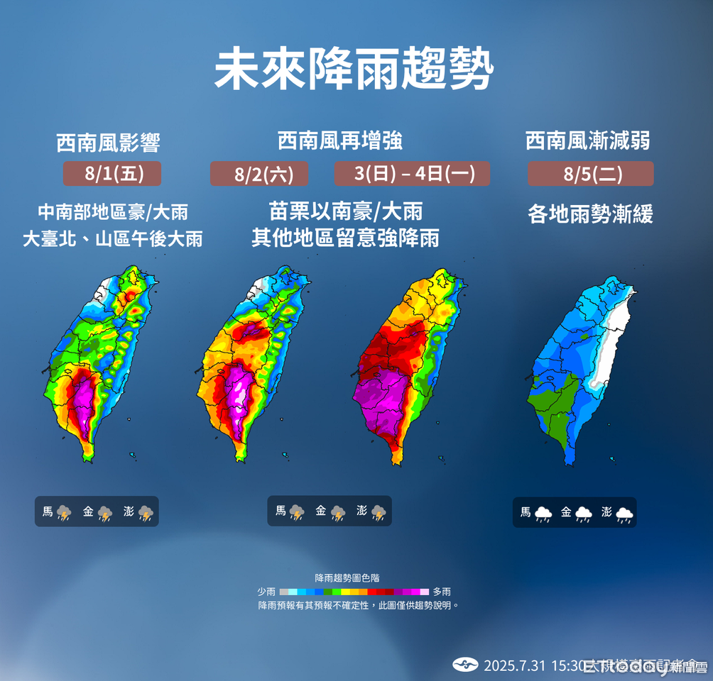 他表示,明天中南部地區仍有局部大雨或豪雨,大台北要留意午後對流發展旺盛,周六西南風增強,苗栗以南容易有降雨,南部近山區有豪雨等級以上降雨。下周日、周一水氣由南往北擴展,西半部降雨明顯,周二太平洋高壓增強,降雨趨緩,仍要留意局部短暫陣雨或雷雨。