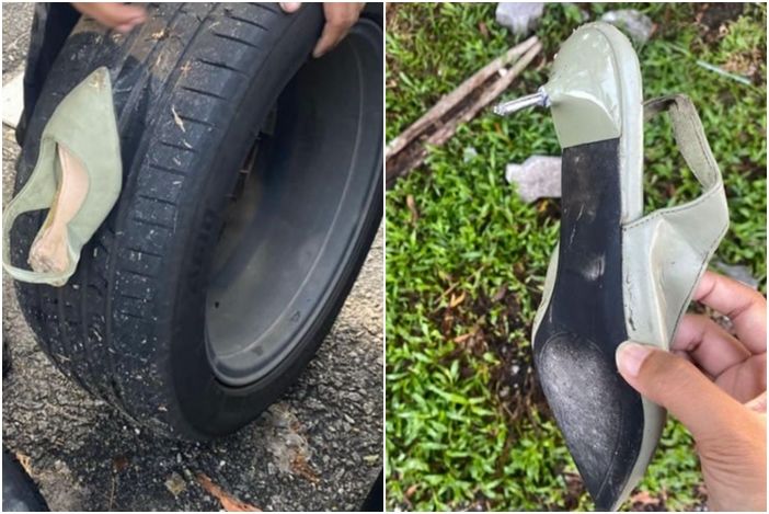 星洲網報導,這名女子透過TikTok發布多張照片,闡述車子輪胎被高跟鞋戳到爆胎的無奈心情,「請不要亂丟高跟鞋,我真的很崩潰,這是什麼情況?該哭還是該笑?」