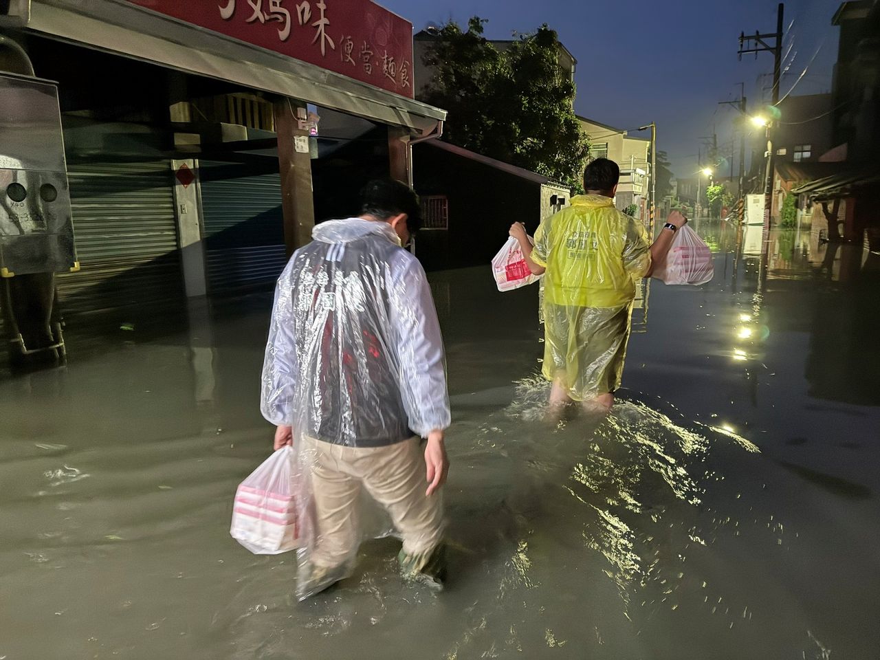 ▲民進黨立委郭國文跟林俊憲一起涉水送便當。(圖/翻攝自Facebook/郭國文)