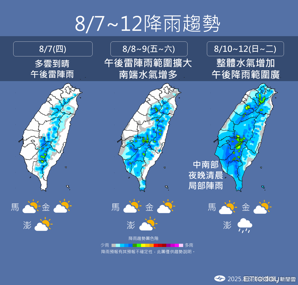 未來一周相對炎熱,以午後驟雨為主,且隨著南邊低壓靠近,降雨也逐步增加及擴大,下周日至周二天氣轉為不穩定,中南部整天有局部陣雨。今天北部高溫上看36度,仍要留意午後雷陣雨,預計持續到傍晚。