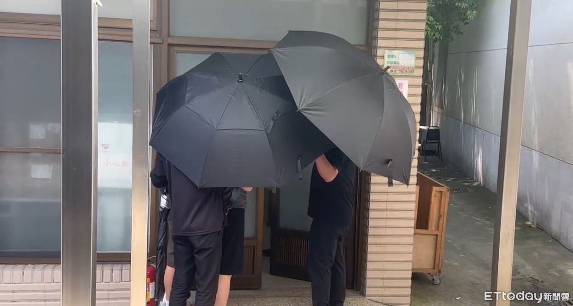 ▲詹妻及1名男性親屬在犯保協會人員以黑傘保護下到場協助相驗。(圖/記者白珈陽攝)