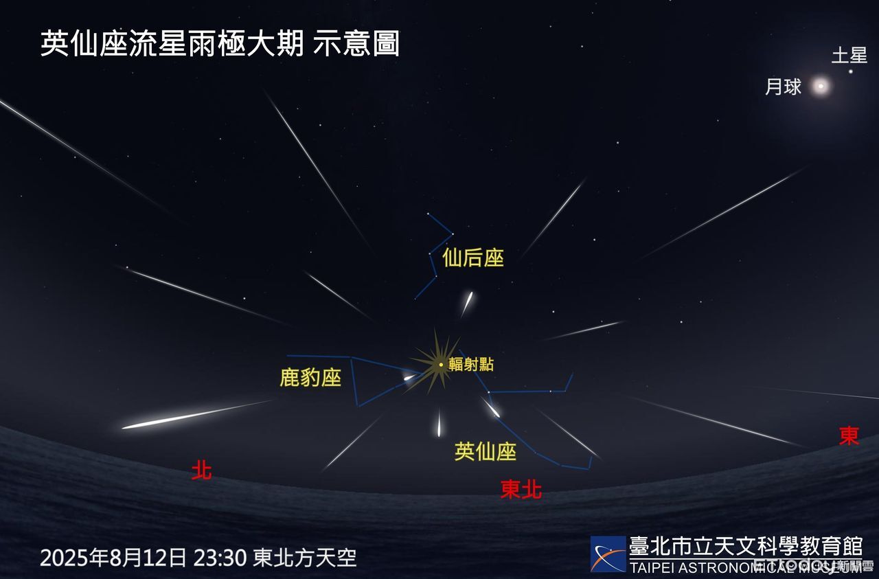台北天文館表示,英仙座流星雨將在周二達到極大期,估計每小時天頂流星出現約為100顆,實際觀賞條件下每小時約可見60顆。流星雨輻射點在當晚8時30分從東北方地平線升起,約45分鐘後進入流星雨最活躍時段,並持續至隔天天亮前,這段時間都是最佳觀測時機。