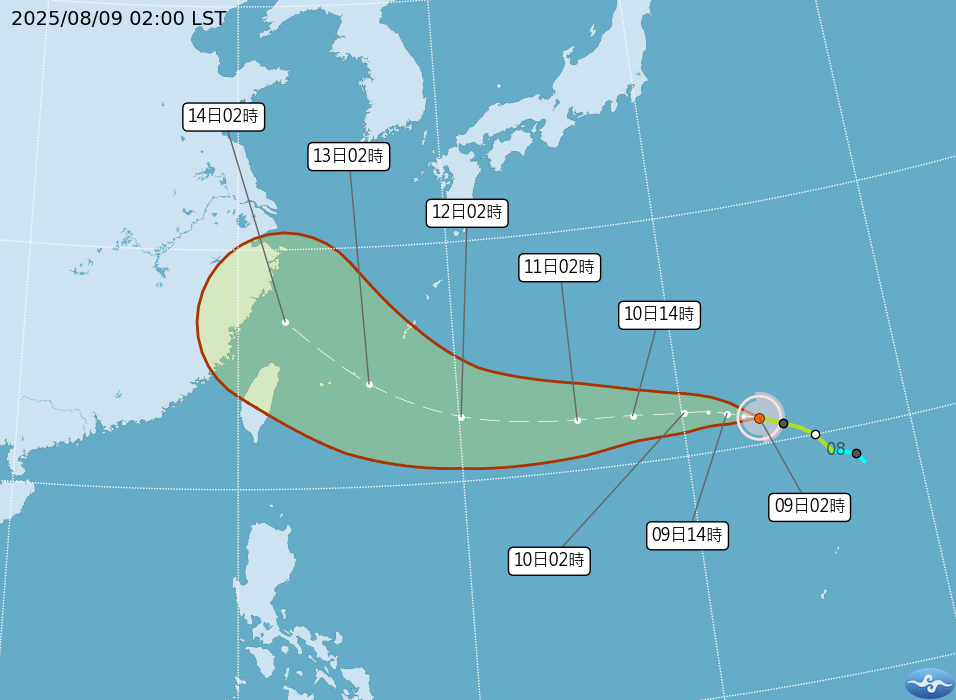 楊柳颱風目前中心位置在台北東北東方海面上,下週三、四最接近台灣,強度會再增強。以目前的潛勢路徑來看有可能會發海警。