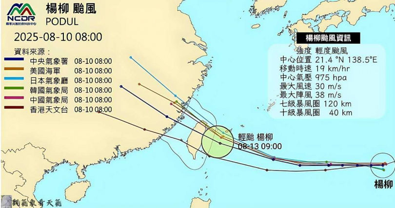 今年第11號颱風「楊柳」目前強度為輕度,專家預估最快今天(10日)晚間有機會發展為中度颱風,而依中央氣象署及各國路徑潛勢預報圖顯示,楊柳進行路徑南修,大機率將是「穿心颱」,並於周三(13日)接近東部海域或有觸陸的可能。