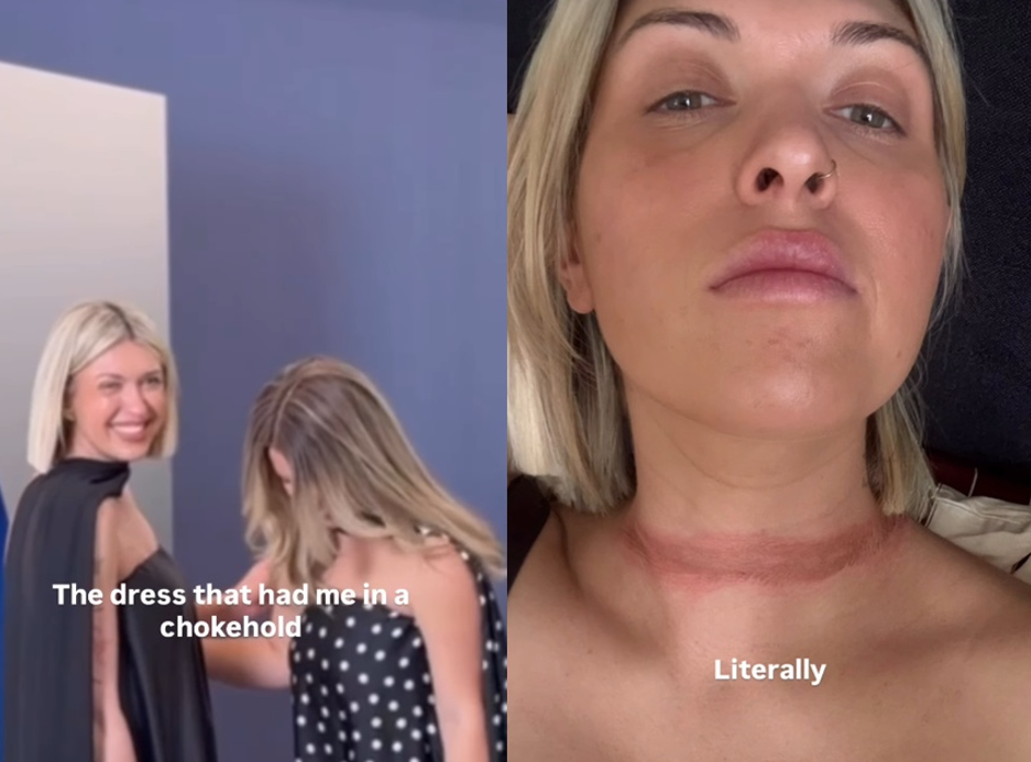 澳洲一名時尚女網紅在網路上分享,日前她穿著一款搭配黑絲長圍巾設計的高雅禮服出席公關活動,沒想到回家路上,長圍巾竟然捲進汽車底部,導致她被緊緊勒住,差點斷頭。