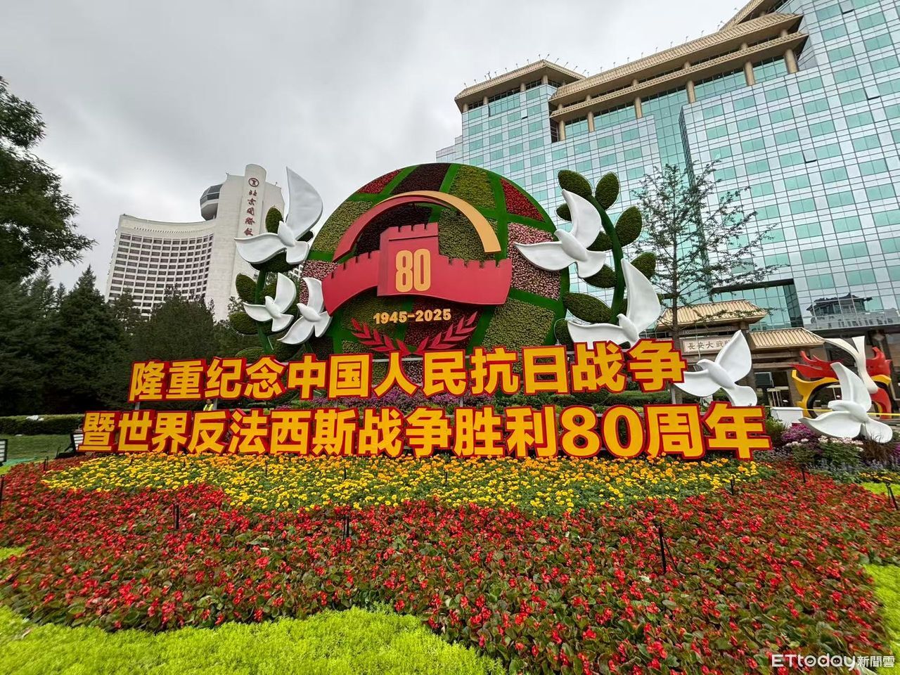 ▼大陸紀念抗戰勝利80周年主題花壇已經出現在北京長安街沿線。(圖/記者陳冠宇攝)