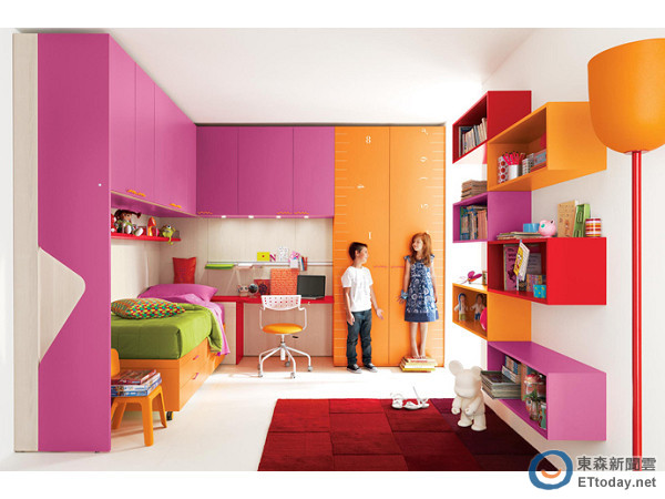 由照片中我們可以發現,光是靠單面或是雙面牆面的配置,就至少都有五具以上的櫃子、收納空間及床舖(甚至兩張床),如此色彩豐富卻又清爽的設計,不僅具有相當的功能性,現代摩登的設計、利用顏色做不同風格的搭配,又能以豐富創意的空間組合激發孩子的創造性與想像力,也不占去太多的房內空間配置。重視孩子成長、正對房間裝潢感到困擾的家長們真的可以好好的參考呢!