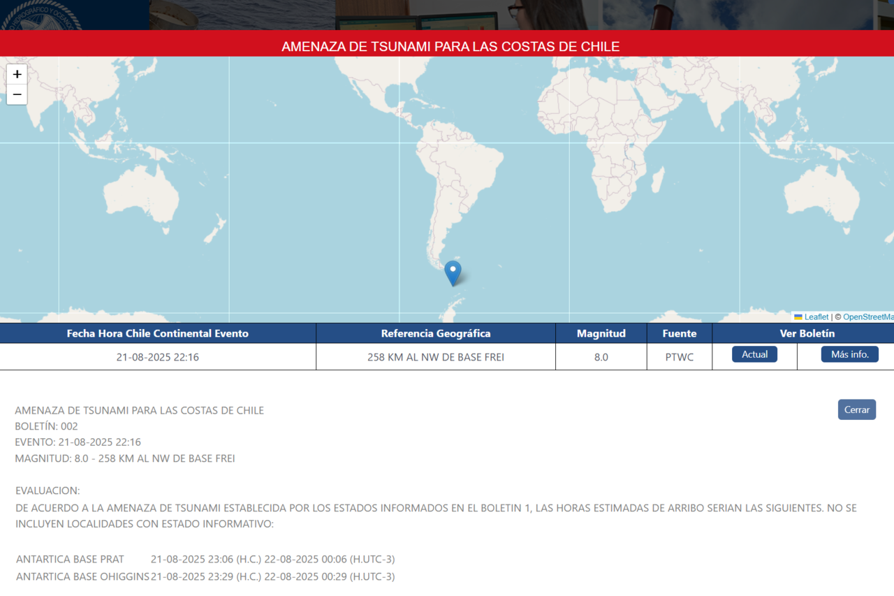 SHOA推估,第一波海嘯將於當地時間21日晚間11時6分(台灣22日上午11時6分)抵達南極普拉特(Prat)研究基地,奧希金斯(O'Higgins)研究基地則可能於當地晚間11時23分(台灣22日上午11時23分)遭到海嘯侵襲。