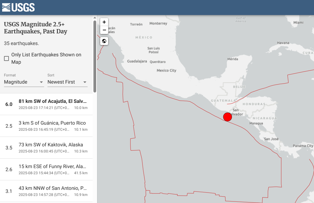 薩爾瓦多外海23日發生規模6.0地震,依據美國地質調查局(USGS)測得數據,這起地震發生在阿卡胡特拉(Acajutla)西南方約81公里處,震源深度約10公里。