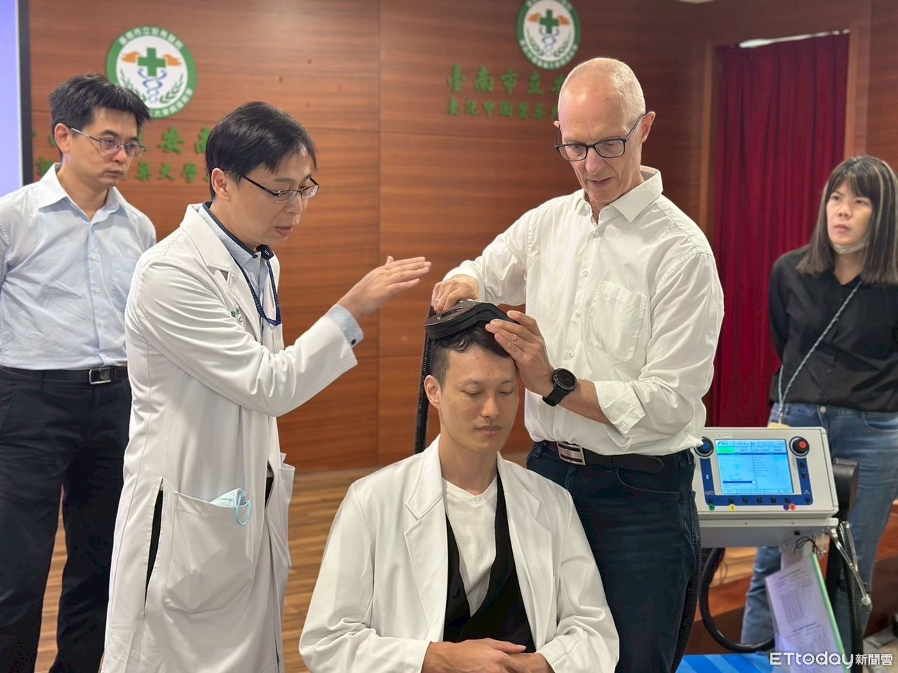 ▲安南醫院舉辦TMS專題演講與實作工作坊,醫學應用科學家Dr. Claus Mathiesen(右)示範TMS(重複經顱磁刺激)治療定位與操作技巧,與精神科張俊鴻主任(左二)進行臨床交流。(記者林東良翻攝,下同)