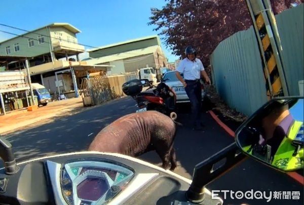 ▲「落跑」大黑豬轉角遇巡警。(圖/桃園警分局提供)