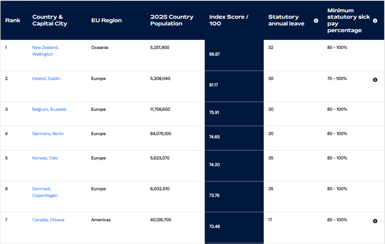 ▲▼ 2025全球工作生活平衡指數第1至7名、第25至31名 。(圖/翻攝自Remote.com)