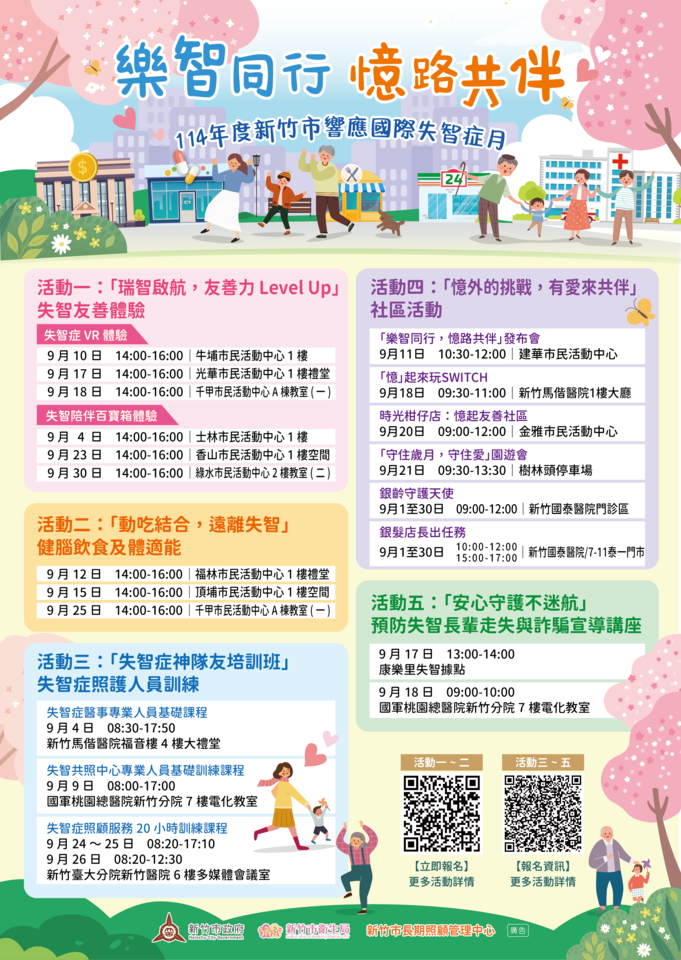 「瑞智啟航:友善力 Level Up」失智友善體驗及「動吃結合,遠離失智」健腦飲食及體適能課程,自即日起可至衛生局健康飲食運動地圖網報名(https://health.hcchb.gov.tw/index.php );「失智症神隊友培訓班」照護人員訓練課程、「憶外的挑戰,有愛來共伴」社區活動及「安心守護不迷航」預防失智長輩走失與詐騙宣導講座,相關活動詳情資訊,請至新竹市長期照顧管理中心查看(https://gov.tw/Nem )。