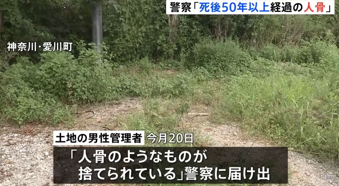 神奈川縣愛川町一處資材置放場空地被發現數具「袋裝人骨」,經調查確認為成人遺骸,死亡時間至少超過50年,警方已開始展開調查。