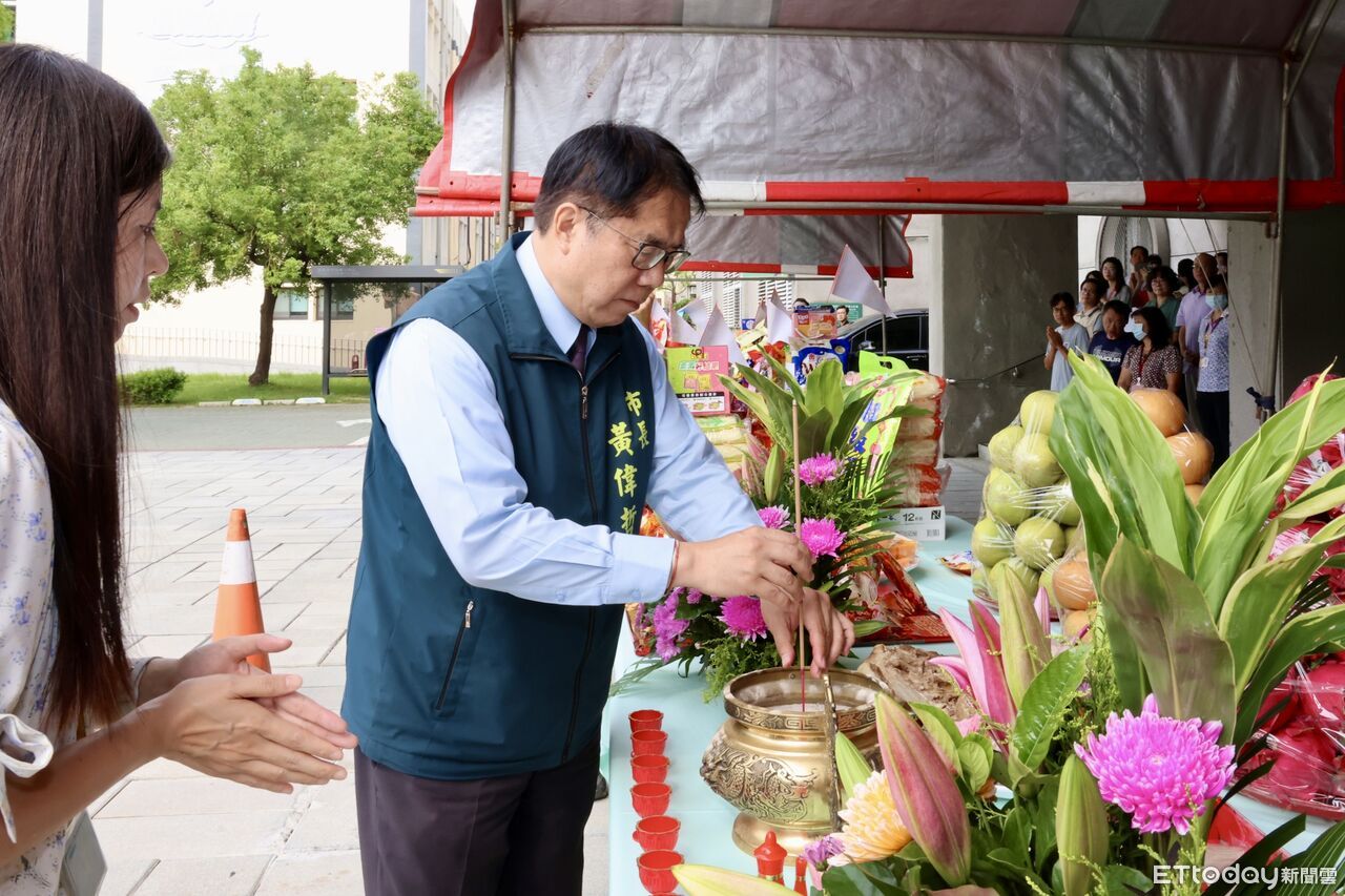 台南市政府2日上午於民治市政中心舉行乙巳年慶讚中元聯合祈福普渡祭典,由市長黃偉哲擔任主祭官,率領市府團隊虔誠祭拜,為響應環保減碳政策,祭典採「以功代金」,黃偉哲手持一柱清香代表全體市府員工上香,祈求市民健康平安,市政運作圓滿順利。