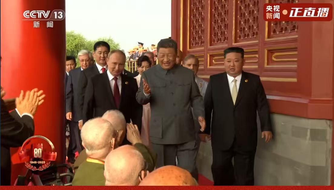 中國今(3)日上午在北京天安門廣場舉行「抗日戰爭暨世界反法西斯勝利80周年」閱兵,中國國家主席習近平、俄羅斯總統普丁與北韓最高領導人金正恩首次齊聚一堂,獲得國際關注。其中,金正恩此次以黑色西裝、亮金色領帶現身,女兒金主愛則並未隨行入場,金正恩與習近平的握手與對話也曝光,現場氣氛融洽。