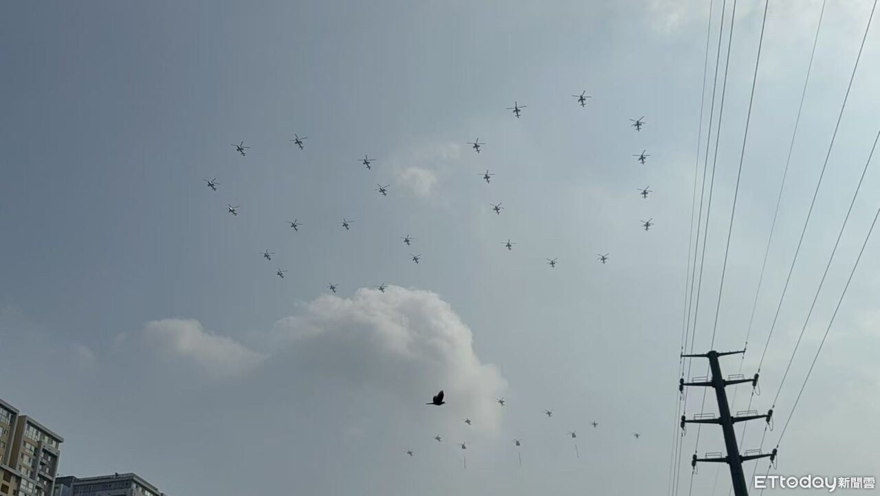 ▲空中護旗隊排列80數字,代表抗戰勝利80週年 。(圖/記者任以芳攝)