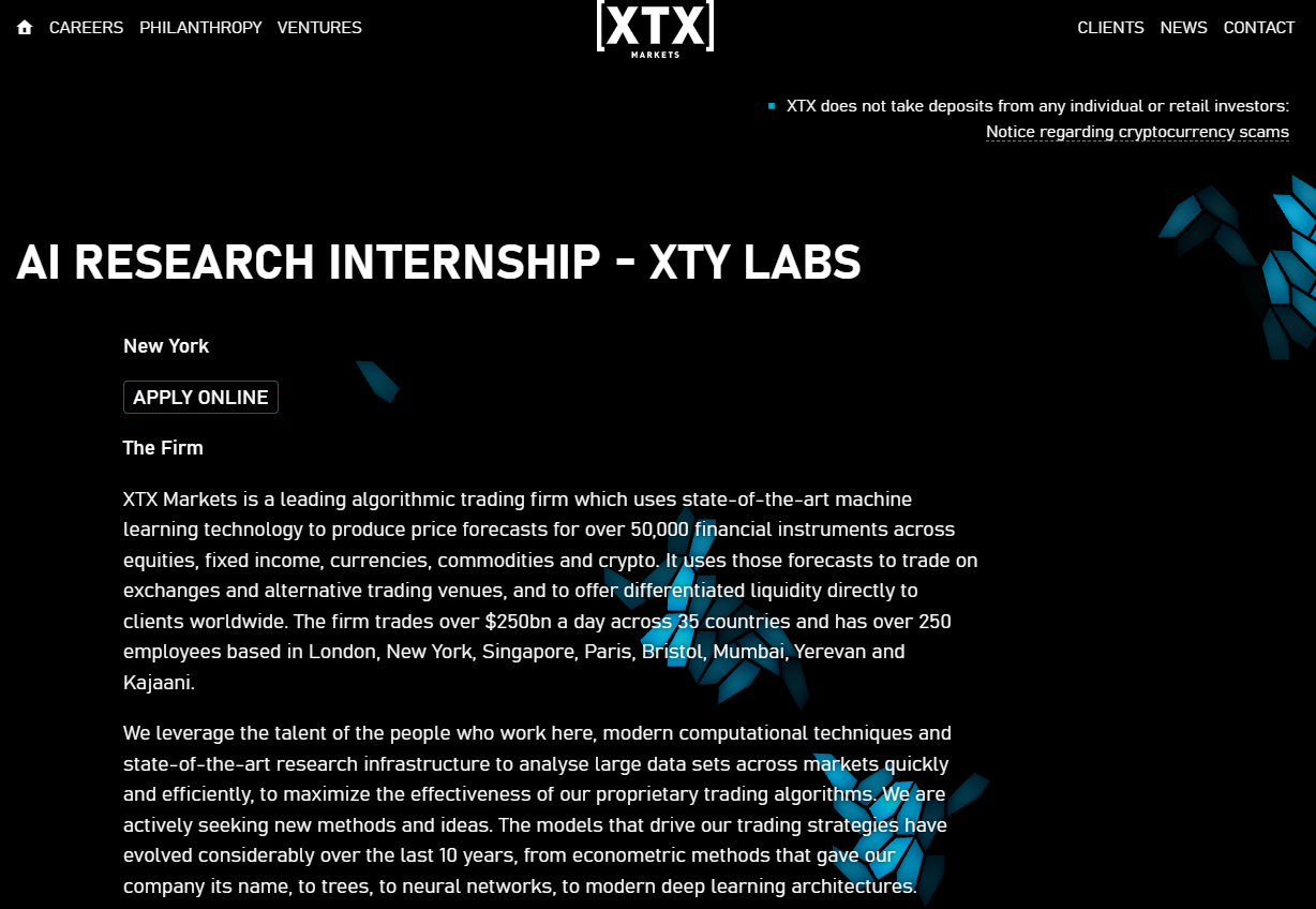▲量化交易巨頭XTX Markets徵求紐約AI研究實習生,薪資優渥。(圖/翻攝自XTX Markets網站)