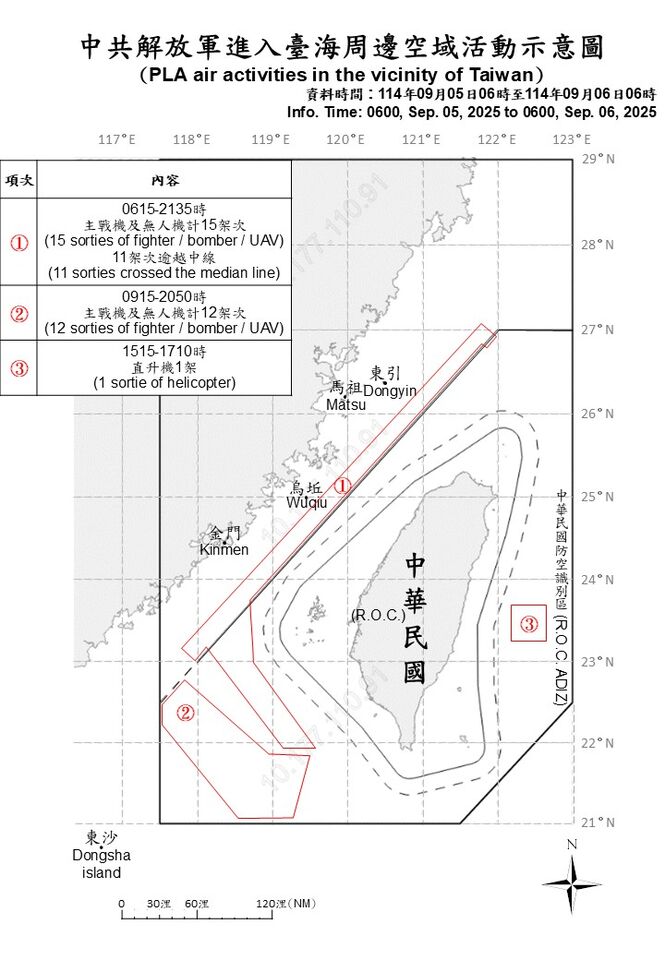 中國日前在北京舉行「九三閱兵」、大秀肌肉,閱兵後,根據國防部今(6日)公布最新共機資訊,自5日上午6時起至今天上午6時止,偵獲共機28架次,配合另共艦6艘、公務船2艘,持續在台海周邊活動。