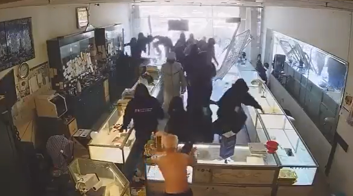 ▲十多名搶匪闖進珠寶店中。(圖/翻攝自X)