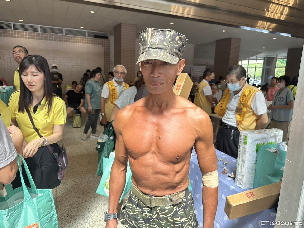▲海棲陸戰隊退役軍官「大熊(56歲)」裸上身、穿著軍褲及軍帽到場捐血。(圖/記者白珈陽攝)