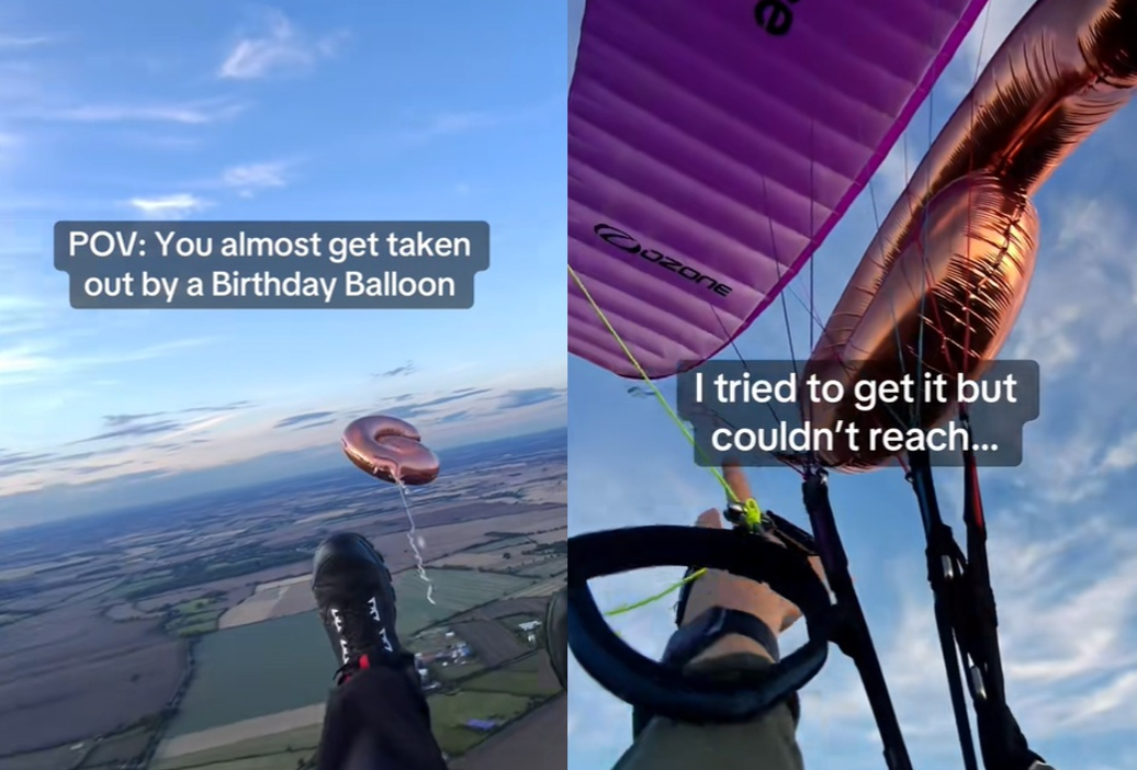 27歲男子麥可(Michael)在TikTok上分享,當他在空中使用滑翔傘飛行時,一個物體突然飛到眼前,他原本以為是一隻鳥或是其他滑翔傘員,沒想到仔細一看,是一顆形狀為數字6的生日氣球。