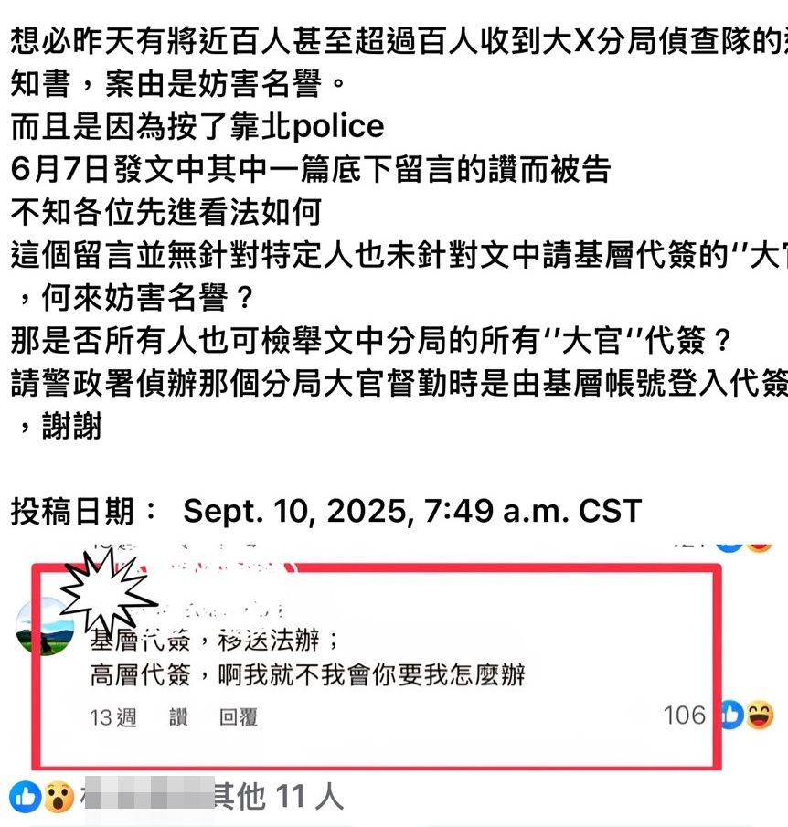台中市警察局1名2線3星、電子公文承辦人的林姓警務正,今年6月發文要求派出所值班員警協助督勤長官如何操作電子巡簽,結果引發基層不滿,有人在「靠北police」大罵腦殘、狗官,林員不滿名譽受到侵害,留言者加上按讚者,一併提告41人,轄區大雅分局表示,陸續通知相關人到案說明,將依妨害名譽罪函送法辦。