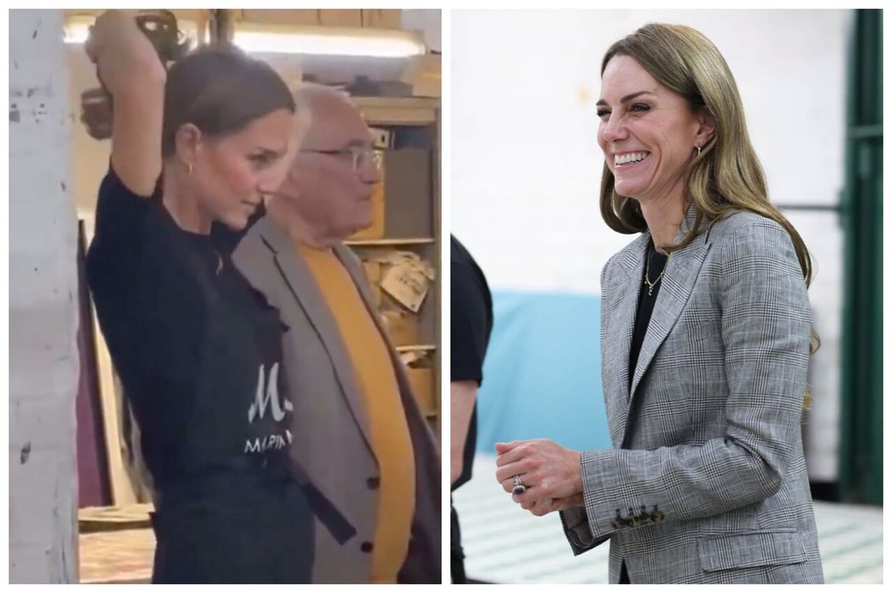 ▲凱特王妃昨參訪紡織工坊(右圖),過程中秀一段「無髮圈綁髮神技」(左圖)。(圖/翻攝princeandprincessofwales IG、X@RoyallyBelle_)